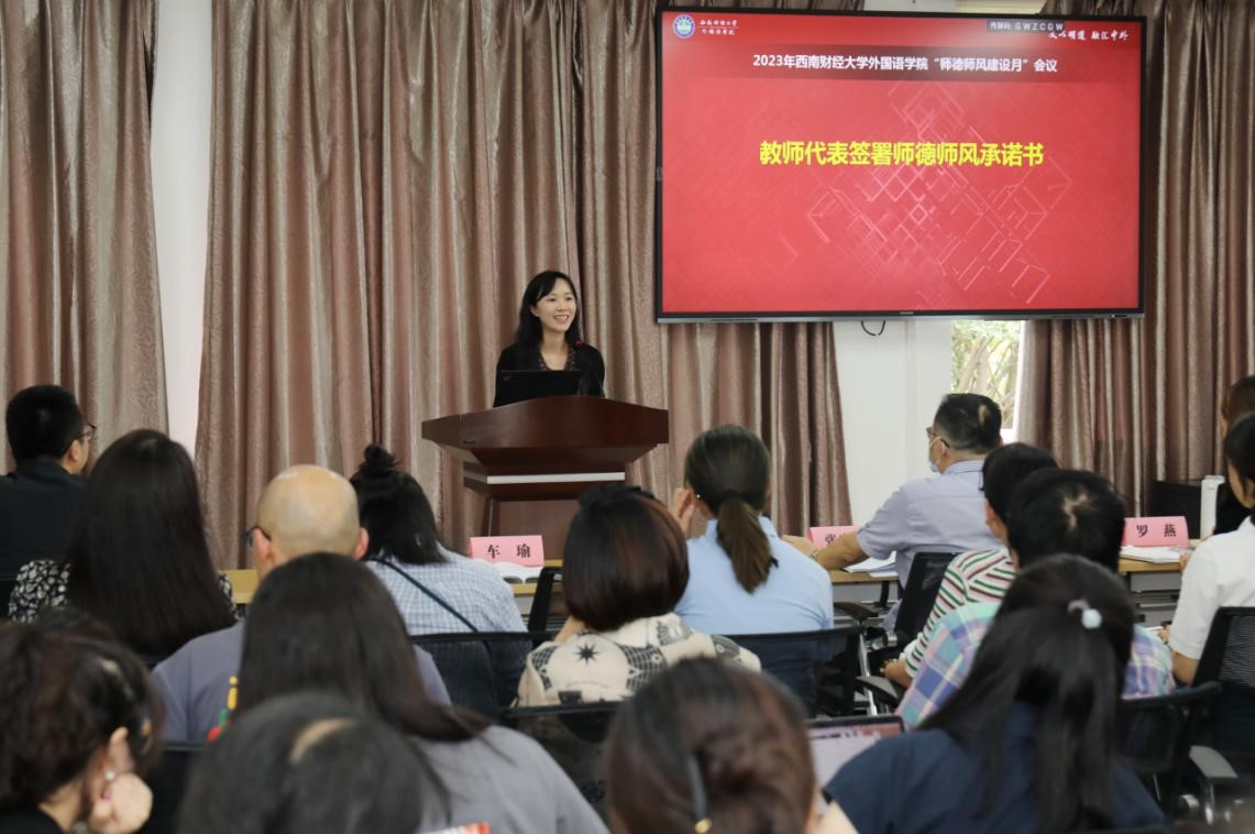 车瑜首先传达了学校关于“师德师风建设月”的文件精神和学校工作部署,并带领全体教职工学习了习近平总书记关于“三个牢固树立”、“四有”好老师等重要论述精神,以及习近平总书记在文化传承发展座谈会上的讲话精神。这些重要论述和讲话精神为教师们提供了指导思想和行动纲领,为外国语学院师德师风建设指明了方向。