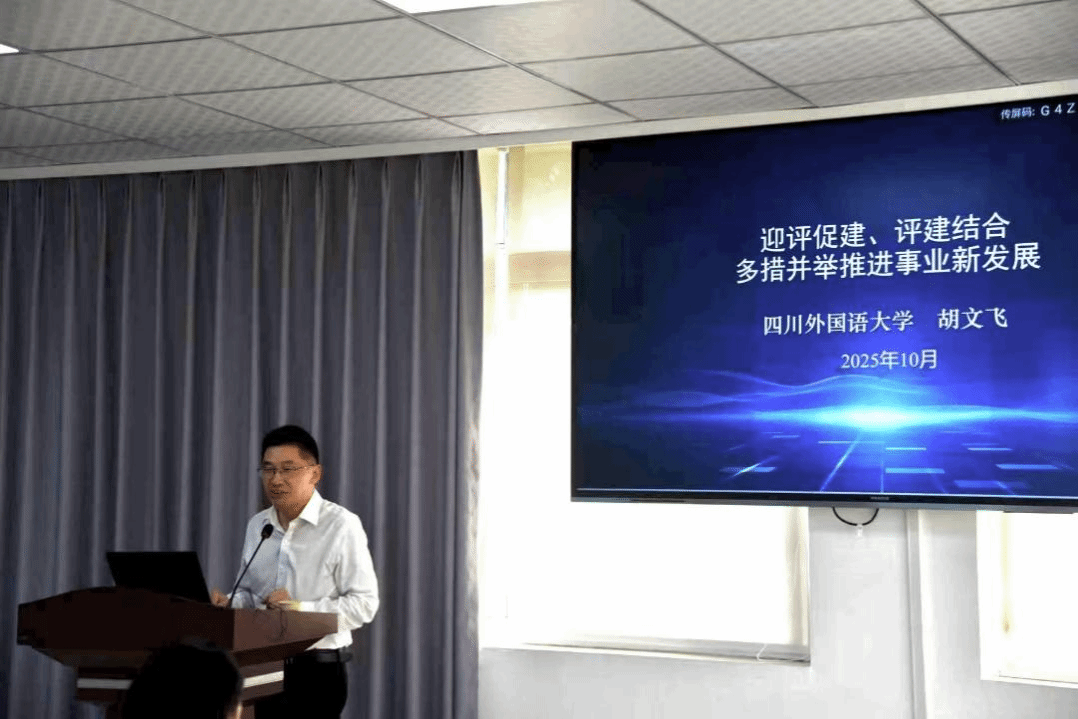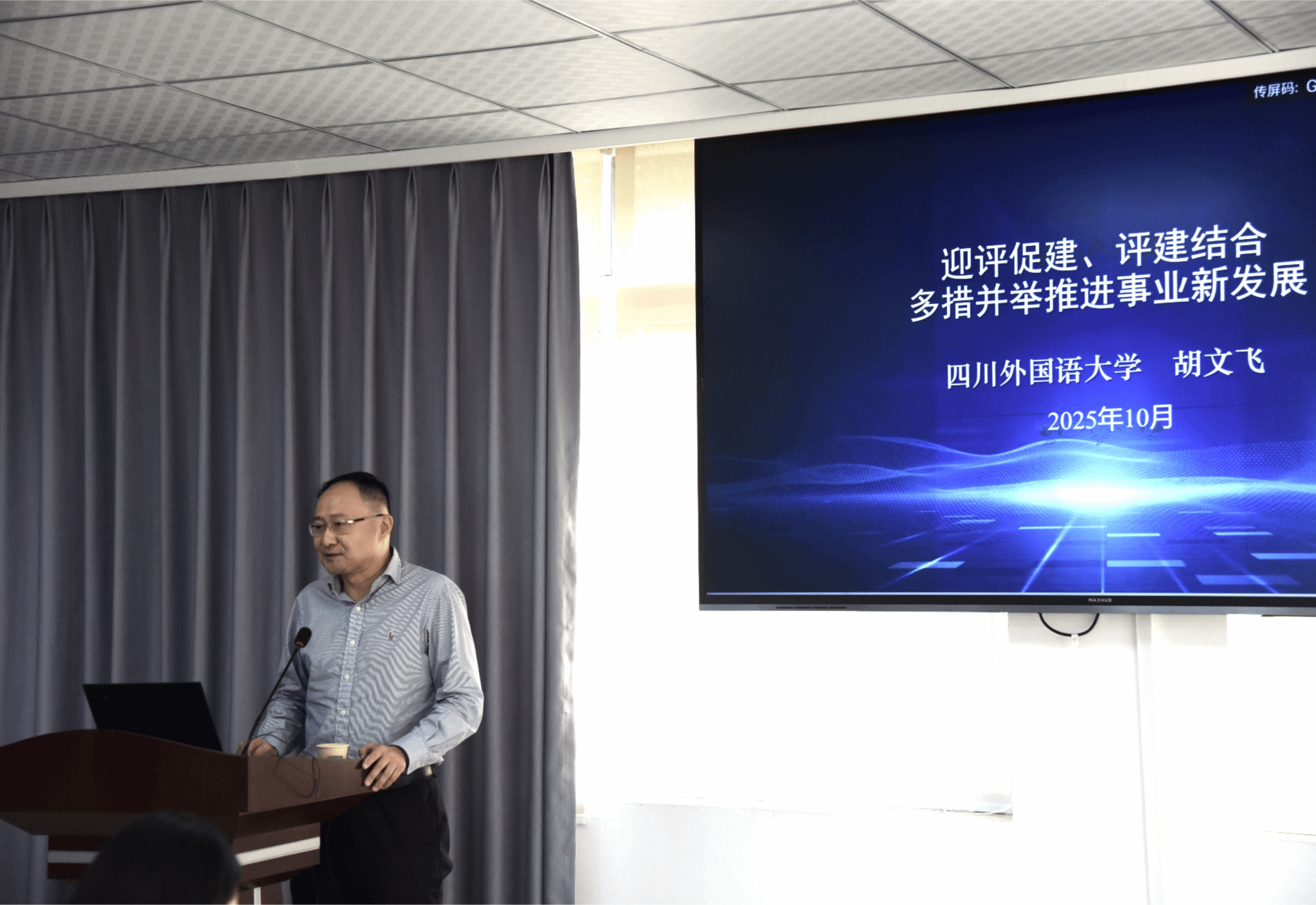10月14日,学院特邀四川外国语大学商务英语学院院长胡文飞作“迎评促建,评建结合,多措并举推进事业新发展”专题讲座。外国语学院全体教职工参加。