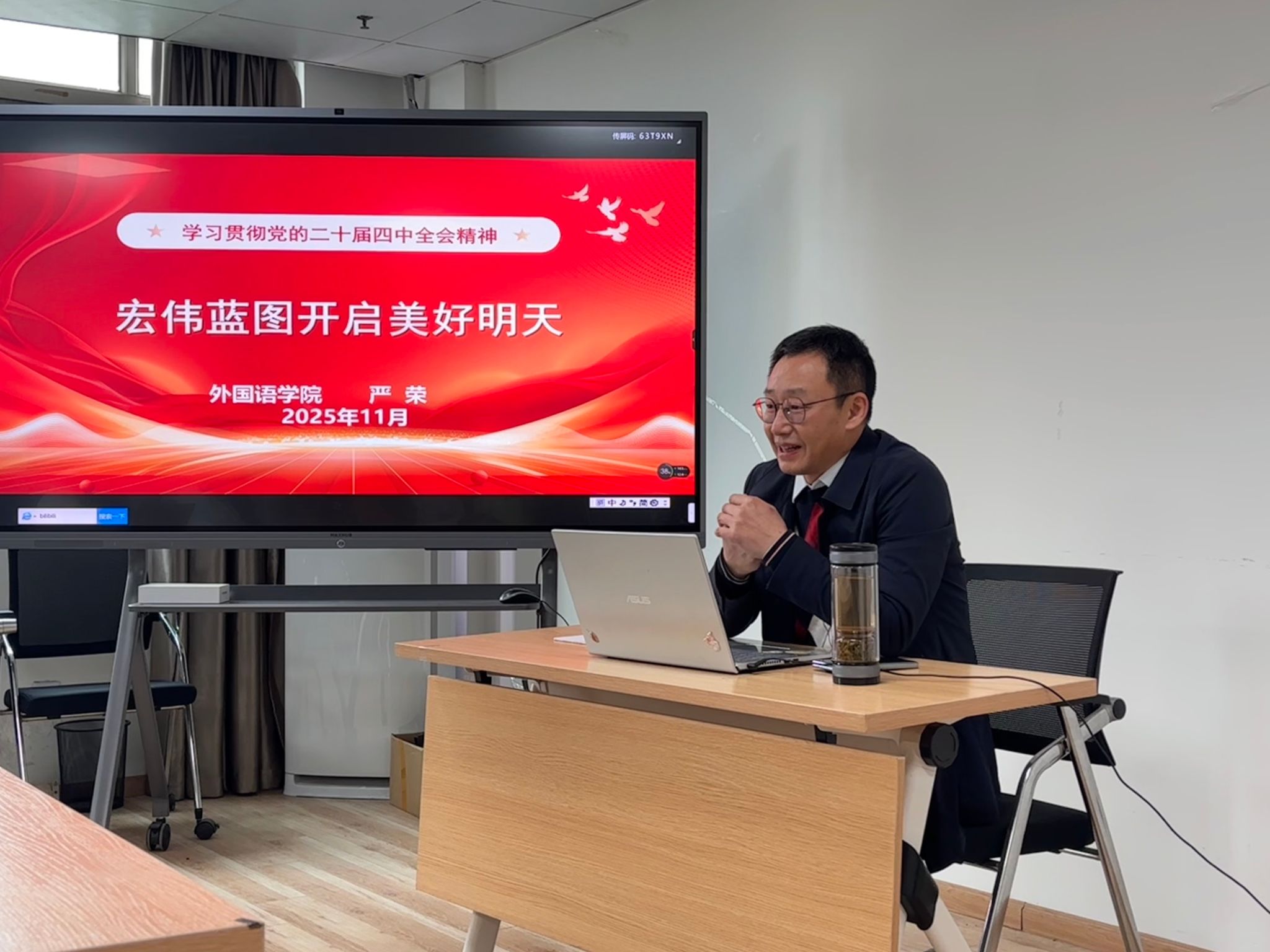为深入学习贯彻党的二十届四中全会精神,进一步提升青年学生的思想政治素养与理论认知水平,11月21日上午,外国语学院在光华楼1411教室开展2025年秋季学期书记讲专题思政课。本次课程由学院党委书记严荣主讲,2025级专业硕士研究生代表到场参与学习。