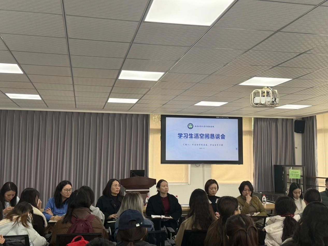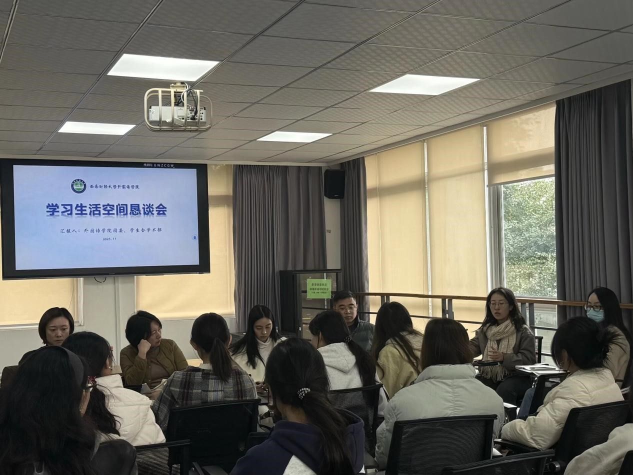 11月25日,外国语学院在通博楼C407会议室举行学生学习生活空间恳谈会。学院党委副书记罗燕、副院长车瑜、MTI教学中心主任杨雨红与各教学系主任、辅导员、教学秘书及学生代表齐聚一堂,就学业发展与生活服务等议题进行了深入交流。