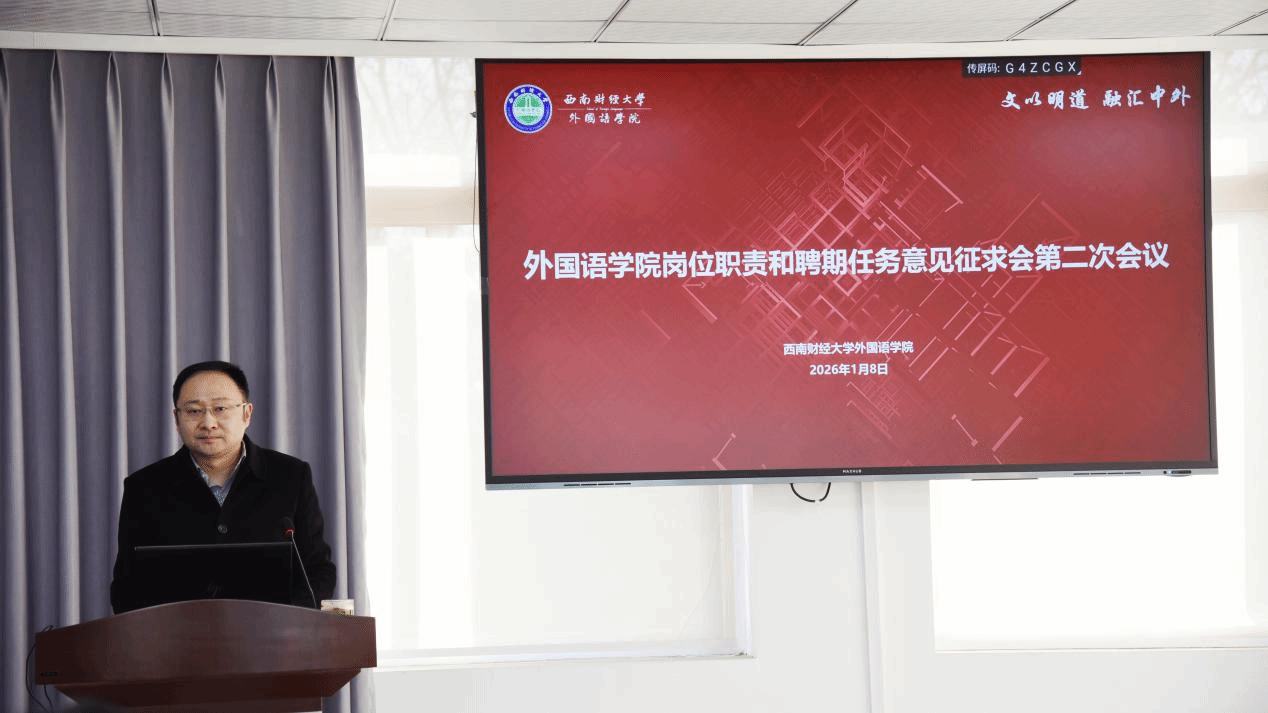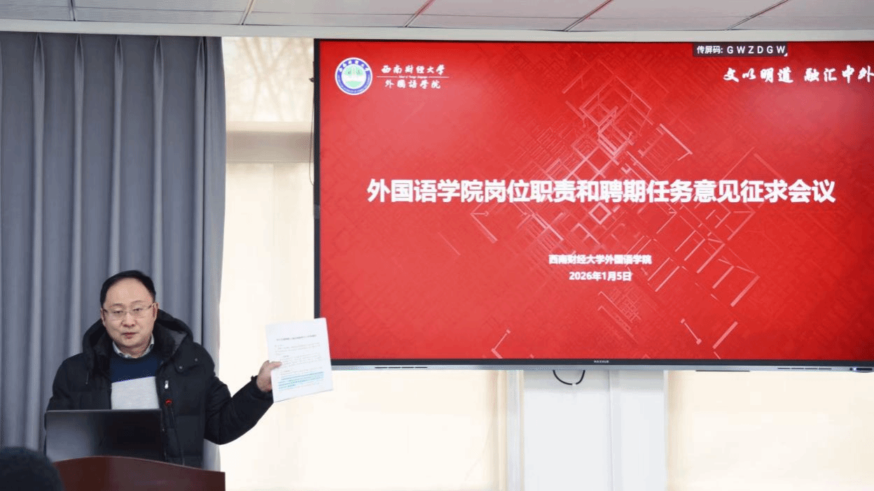 为科学规划教师职业发展路径,健全学院岗位管理与评价体系,外国语学院分别于1月5日与1月8日,在通博楼C407会议室召开两场岗位职责和聘期任务意见征求会议。学院院长张家瑞、副院长车瑜及学院教师代表参加了会议。