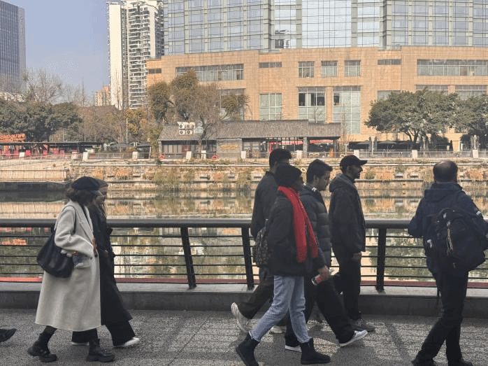 活动由四川省导游协会副会长、四川外语导游暨出境领队联盟理事长陈健先生担任讲解嘉宾。陈健先生带领留学生沿府南河展开文化探访,先后途经安顺廊桥、合江亭、东门码头等历史地标,最终抵达望平街。途中,陈健先生结合城市发展变迁,为留学生详细讲解成都的自然景观、建筑特色及人文故事,帮助参与者深化对成都文化的理解,增强情感联结。