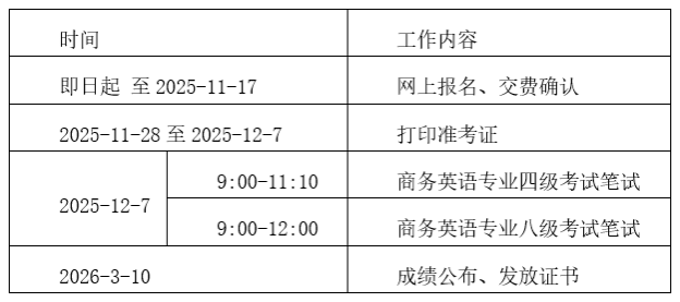 为提升高等学校商务英语专业本科教学质量,促进商务英语专业教学改革,满足国际商务行业的用人需求,根据《关于筹备开展全国商务英语专业四、八级考试工作的通知》([2012]外经贸企协字第15号)精神,经中国对外贸易经济合作企业协会、高等教育出版社研究决定,于2025年12月7日开展全国商务英语专业四、八级考试工作。现将相关情况通知如下: